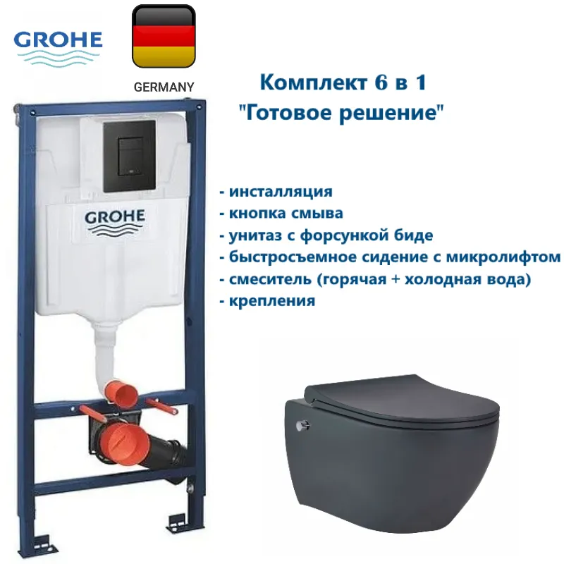 КОМПЛЕКТ + Grohe RAPID SL 3 В 1 ДЛЯ УНИТАЗА, ВЫСОТА УСТАНОВКИ 1,13 М. чёрный матовый + Bogen Унитаз подвесной безободковый с форсункой биде со встроенным смесителем горячей и холодной воды с быстросъёмным сиденьем микролифт черный матовый