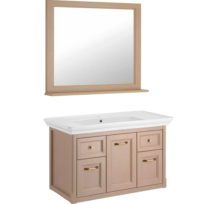 - Элегантный дизайн: Комплект мебели выполнен в классическом стиле и включает золотую фурнитуру, что придаёт ванной комнате благородный вид.