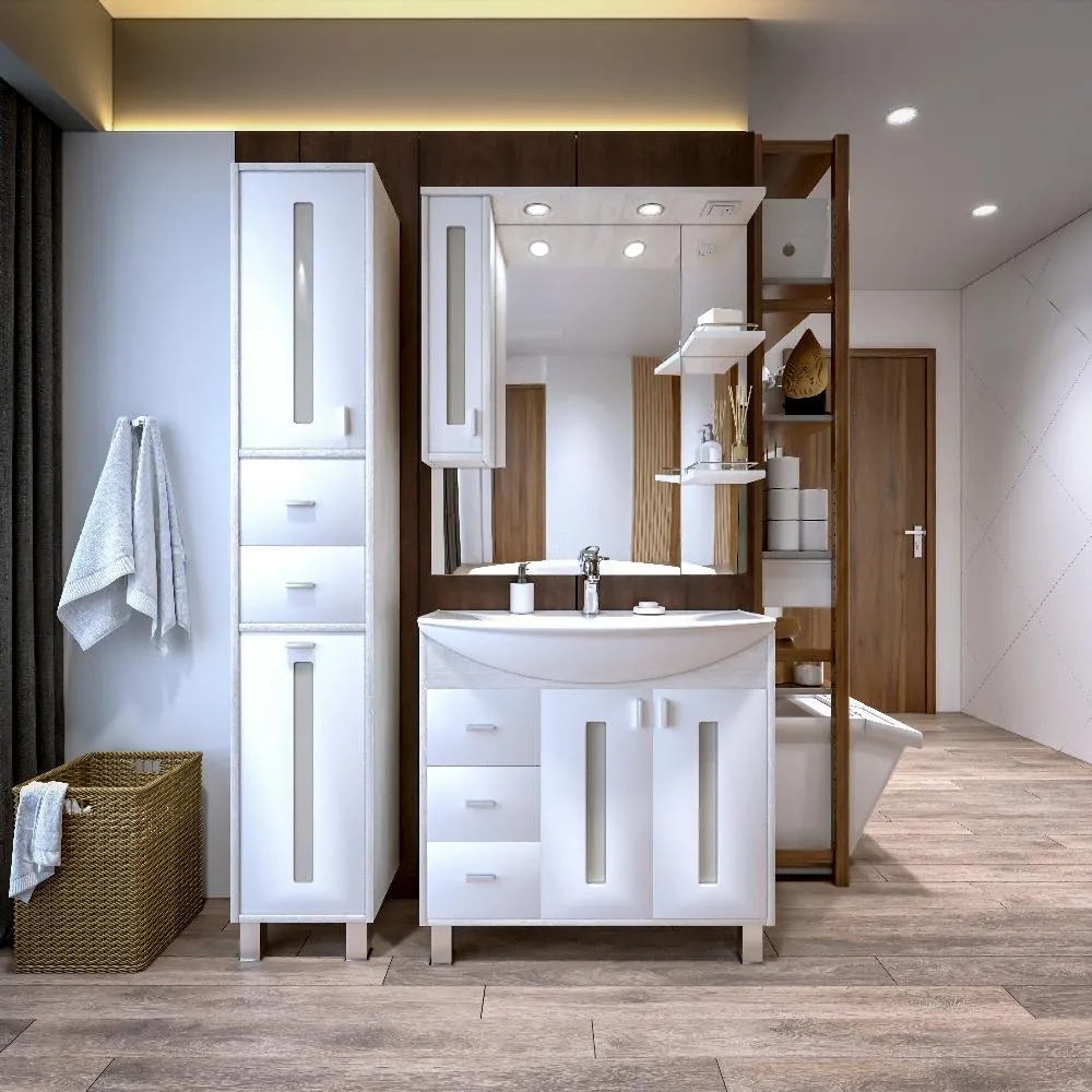 Комплект мебели Бриклаер БАЛИ состоит из: Тумба под раковину напольная Бриклаер БАЛИ светлая лиственница/белый, 85 см, Пенал Бриклаер БАЛИ 35 см, светлая лиственница/белый, Раковина Kirovit Стиль 850, 86,5 см, Зеркало со шкафом Бриклаер БАЛИ 90 см правое, светлая лиственница/белый.