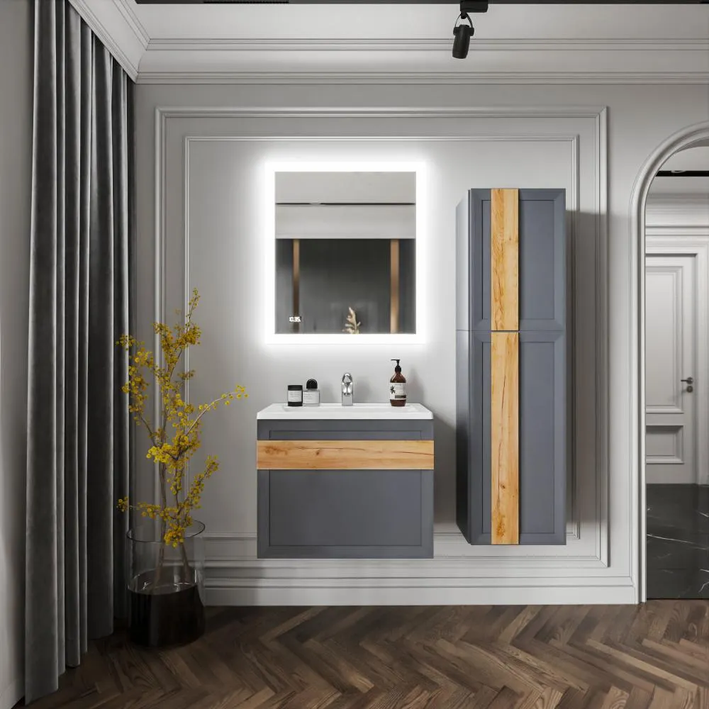 Комплект мебели Бриклаер БЕРЛИН состоит из: Тумба под раковину подвесная Бриклаер БЕРЛИН оникс серый, 70 см, Ручка для тумбы Бриклаер БЕРЛИН 70 см, дуб золотой, Раковина Paola Mario 700, белый, Шкаф навесной Бриклаер БЕРЛИН 60 см, оникс серый, Шкаф навесной Бриклаер БЕРЛИН 90 см, оникс серый, Ручка для шкафа Бриклаер БЕРЛИН 60 см, дуб золотой, Ручка для шкафа Бриклаер БЕРЛИН 90 см, дуб золотой, Зеркало Бриклаер Вега/Мальта 75 LED подсветка на взмах руки, часы.