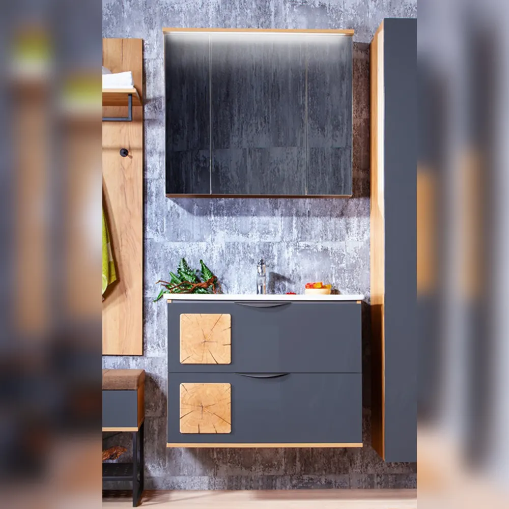 Комплект мебели Бриклаер Форест состоит из: Тумба под раковину подвесная Бриклаер Форест дуб золотой/антрацит, 80 см, Раковина Paola Mario 800, белый, Зеркальный шкаф Бриклаер Форест 80 см, дуб золотой/антрацит.