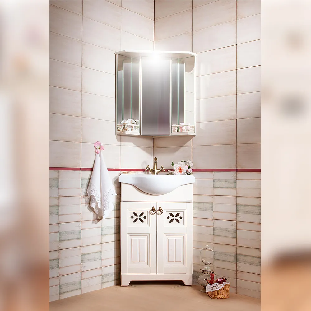 Комплект мебели Бриклаер КАНТРИ состоит из: Тумба под раковину напольная угловая Бриклаер КАНТРИ бежевый дуб прованс, 60 см, Раковина Kirovit Классик, угловая, Зеркальный шкаф Бриклаер КАНТРИ с балюстрадой, бежевый дуб прованс.