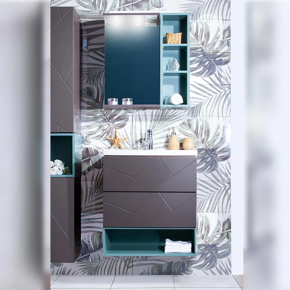 Комплект мебели Бриклаер КРИСТАЛЛ состоит из: Тумба под раковину подвесная Бриклаер КРИСТАЛЛ ясень анкор темный/графит, 60 см, Раковина Cersanit MODUO SLIM UM-MOD60SL/1, 60 см, Ниша для тумбы Бриклаер КРИСТАЛЛ 60 см, муссон, Шкаф навесной открытый Бриклаер КРИСТАЛЛ 20 см, муссон, Зеркало Бриклаер КРИСТАЛЛ 40 см, ясень анкор темный.