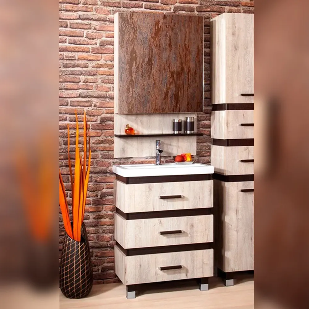 Комплект мебели Бриклаер ТЕХАС состоит из: Тумба под раковину напольная Бриклаер ТЕХАС кантри/венге, 60 см, Раковина Kirovit Фостер 600, 61 см, Зеркальный шкаф Бриклаер ТЕХАС 60 см, кантри/венге.
