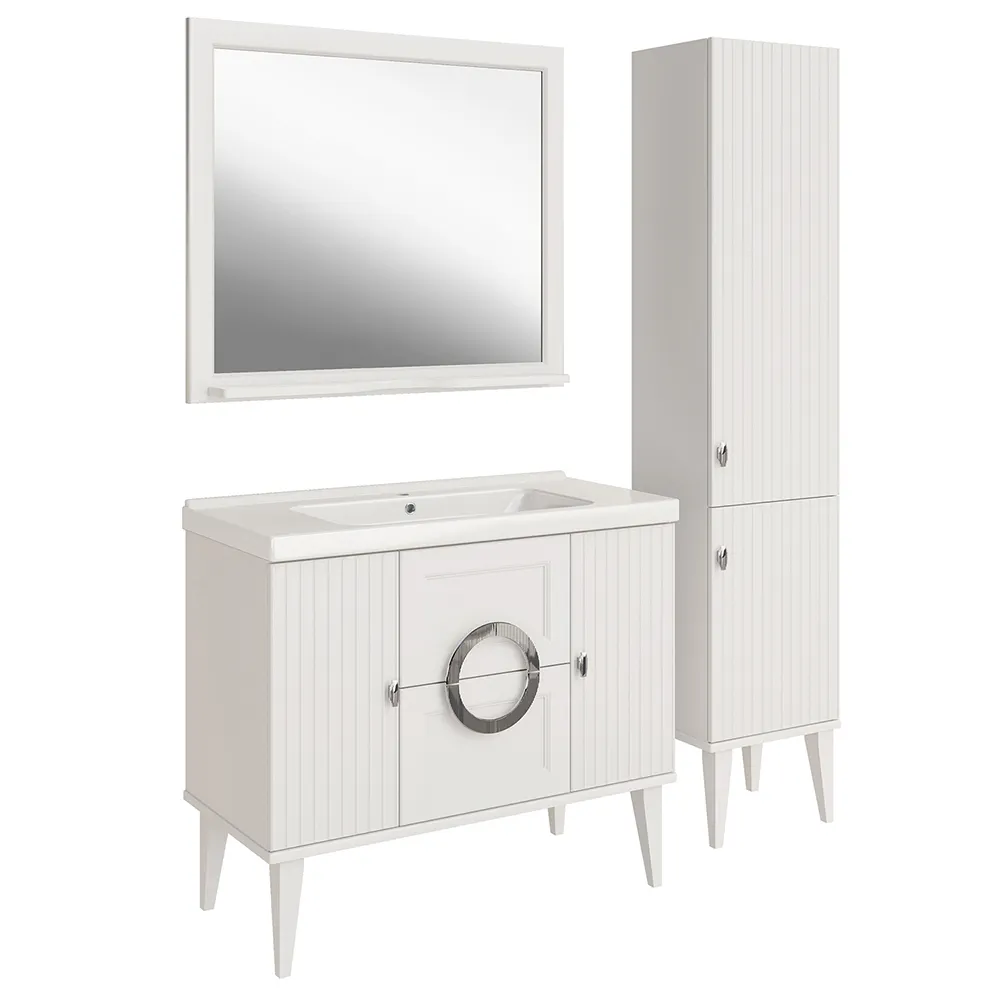 Мебель «Федерика» воплощает в себе безупречный стиль и современный дизайн. Тумба из МДФ, каркас и ножки из массива ясеня. Фасады дверок тумбы и пенала рефленые. Дверцы оснащены системой плавного закрывания, ящики с доводчиками