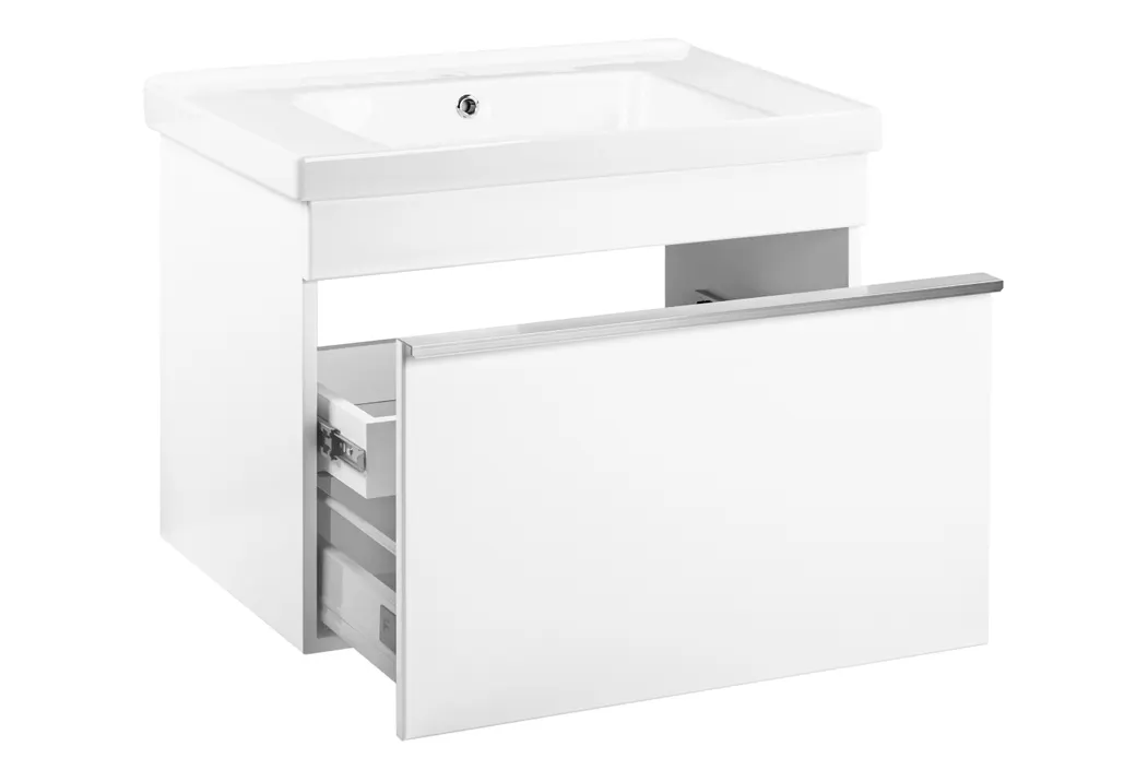 Комплект Novel 90 Подвесной модуль с усиленной конструкцией и раковиной ----------------------Ключевые характеристики Параметр Описание Габариты тумбы (Ш?Г?В): 865 ? 500 ? 467 мм Раковина: Интегрирована Габариты раковины (Ш?Г?В): 905 ? 55 ? 465 мм Тип установки: Подвесная Система хранения: 2 выдвижных ящика Материалы: Корпус и фасад из МДФ с влагостойкой эмалью Толщина МДФ: До 20 мм (усиленная прочность) Нагрузка ящика: До 40 кг (специальная фурнитура) Поверхность: Глянцевая Цвет: Белый Раковина: Сантехнический фарфор (в комплекте) ----------------------Конструктивные преимущества ? Прочность: - Утолщённый МДФ (20 мм) устойчив к деформации. - Фурнитура с максимальной нагрузкой 40 кг на ящик.? Влагостойкость: - Эмалевое покрытие защищает от пара и брызг.? Функциональность: - Полностью выдвижные ящики с плавным ходом. - Регулируемые опоры для точного выравнивания.? Эргономика: - Подвесной монтаж экономит пространство и упрощает уборку. - Оптимальная глубина 500 мм под стандартные санузлы. ----------------------Комплектация и совместимость - В комплекте: - Тумба с 2 ящиками. - Раковина из сантехнического фарфора - Модульная система: - Совместима с пеналами Novel (арт. NVL000P, 350?1600?347 мм). - Пример сборки: Пенал + Novel 70 + Пенал (ширина системы: 1365 мм). ----------------------Сравнение с другими моделями серии Novel Модель Ширина тумбы Ширина раковины Особенности Novel 70 665 мм 700 мм Средний размер (баланс вместимости/компактности) Novel 60 565 мм 604 мм Компактная версия Novel 90 865 мм 905 мм Максимальная вместимость ----------------------Рекомендации по применению • Для помещений: Средние и просторные ванные комнаты.• Стиль: Современный (глянец + лаконичные линии).• Монтаж: Требуется прочное крепление к стене из-за веса раковины и МДФ.• Уход: Глянцевую поверхность очищать мягкими средствами без абразивов. Производитель: Европейский дизайн (указано: Дизайн от ведущих производителей Европы).Примечание: Габариты указаны в мм (Ширина ? Глубина ? Высота). Производитель оставляет право изменять конструкцию. ----------------------Тумба Novel 90 сочетает практичность (2 вместительных ящика, влагостойкость), эстетику (белый глянец) и инженерную надежность (МДФ 20 мм, фурнитура 40 кг). Идеальна для тех, кто ищет готовое решение «тумба + раковина» без компромиссов в качестве.