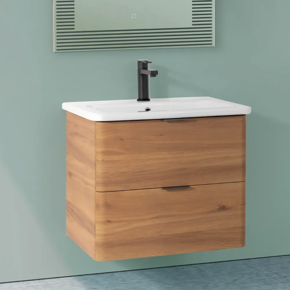 Серия Wooden: Подвесные тумбы с текстурой натурального ореха Производитель: Европейский дизайн (указано: "Дизайн от ведущих производителей Европы") ----------------------Модельный ряд Артикул Модель Габариты тумбы (Ш?Г?В) Раковина в комплекте (Ш?Г?В) 14000013 Wooden 60 580 ? 500 ? 450 мм 605 ? 30 ? 460 мм 14000018 Wooden 80 780 ? 500 ? 450 мм 800 ? 30 ? 460 мм ----------------------Ключевые характеристики Параметр Описание Конструкция Подвесной монтаж (визуальная лёгкость + удобство уборки) Система хранения 2 вместительных выдвижных ящика с плавным ходом Материалы • Корпус/фасад: МДФ с декоративной плёнкой (толщина до 20 мм)• Раковина: Сантехнический фарфор Дизайн • Поверхность: Текстурированная (имитация древесных волокон)• Цвет: Орех (теплый натуральный оттенок) ----------------------Преимущества серии ? Экологичная эстетика: - Текстура "под дерево" создаёт атмосферу природного тепла в интерьере.? Готовые решения: - Раковины идеально соответствуют ширине тумб (605 мм для 580 мм тумбы; 800 мм для 780 мм тумбы).? Надёжность: - Усиленный корпус из МДФ 20 мм + влагостойкая плёнка. - Регулируемая фурнитура европейского производства.? Эргономика: - Универсальная глубина 500 мм подходит для большинства помещений. ----------------------Сравнение моделей Параметр Wooden 60 Wooden 80 Ширина 580 мм (компактная) 780 мм (просторная) Раковина 605 мм (минимальный свес) 800 мм (гармоничное сочетание) Вместимость Оптимальна для 1-2 человек Идеальна для семейного использования Рекомендации Санузлы ? 5 м? Совмещённые ванные ? 6 м? ----------------------Дизайнерские особенности • Текстура: 3D-эффект натурального дерева (визуальный и тактильный комфорт).• Цвет "Орех": - Тёплый коричнево-бежевый оттенок ? сочетается с: - Керамогранитом под бетон/камень - Золотистой/матовой черной сантехникой - Плетёными корзинами, растениями ----------------------Серия Wooden — идеальный выбор для создания уютной ванной комнаты в эко-стиле или скандинавском дизайне. Преимущества:• Естественность — текстура "орех" визуально смягчает современные интерьеры.• Практичность — подвесная конструкция + 2 ящика для организованного хранения.• Гармония — точное соответствие размеров тумб и раковин.