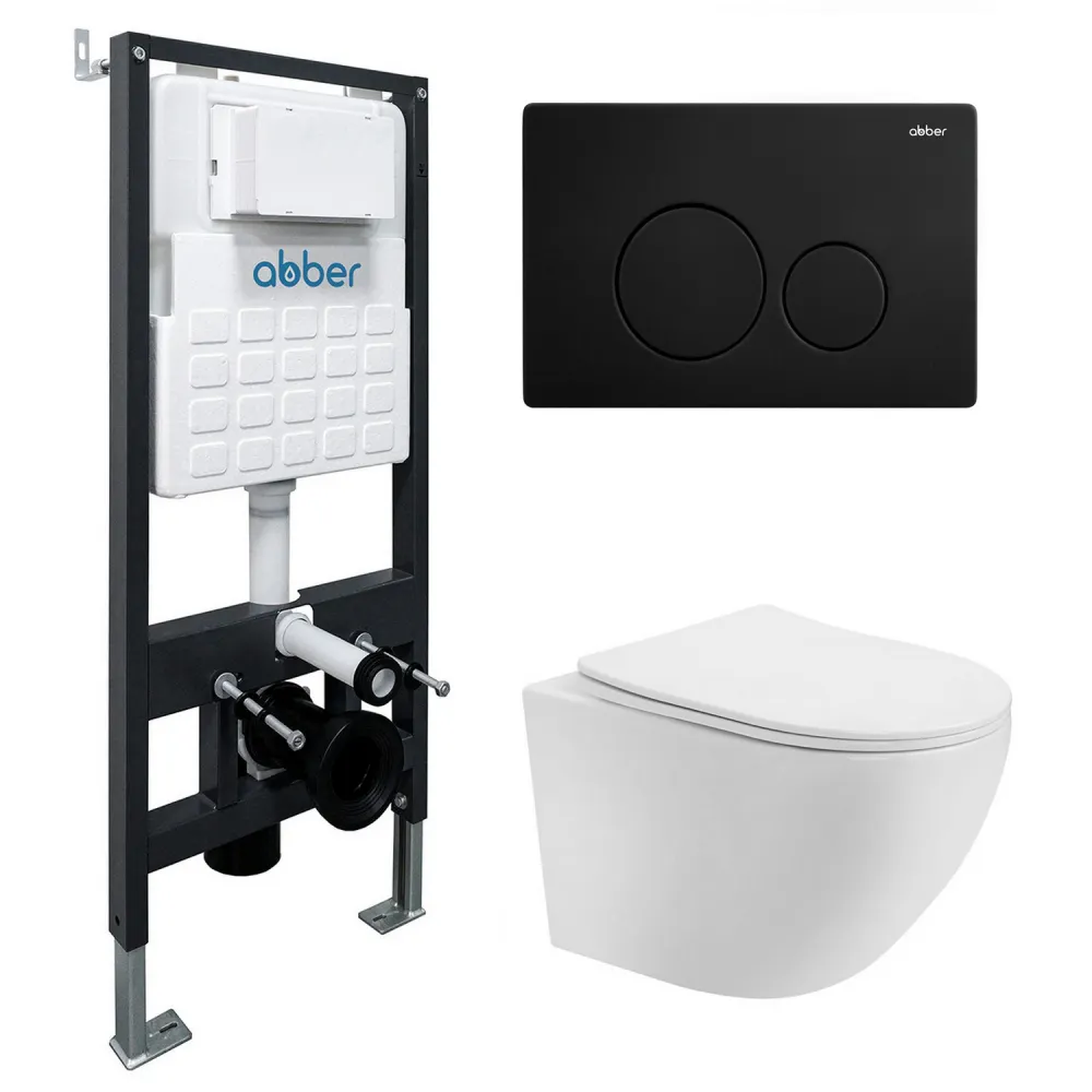 Комплект подвесной унитаз ABBER Bequem AC1100T белый с инсталляцией AC0105 и кнопкой AC0121MB черный матовый арт-AC1100T-AC0105-AC0121MB
