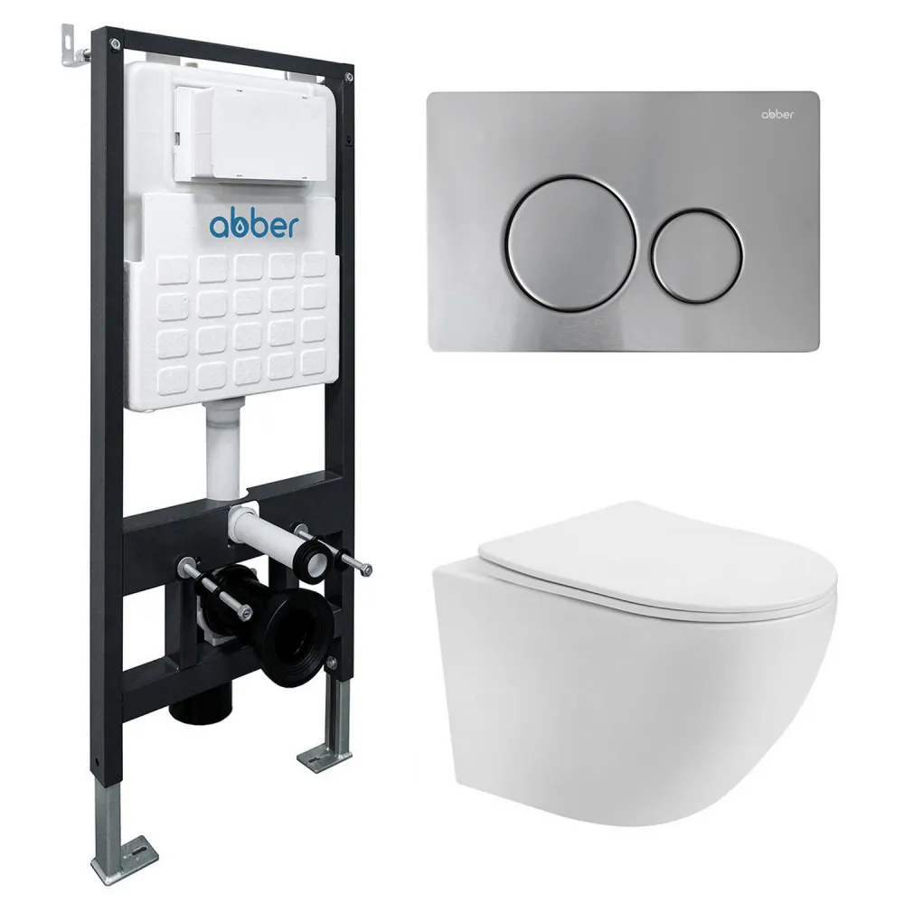 Комплект подвесной унитаз ABBER Bequem AC1100T белый с инсталляцией AC0105 и кнопкой AC0121MCH матовый хром арт-AC1100T-AC0105-AC0121MCH