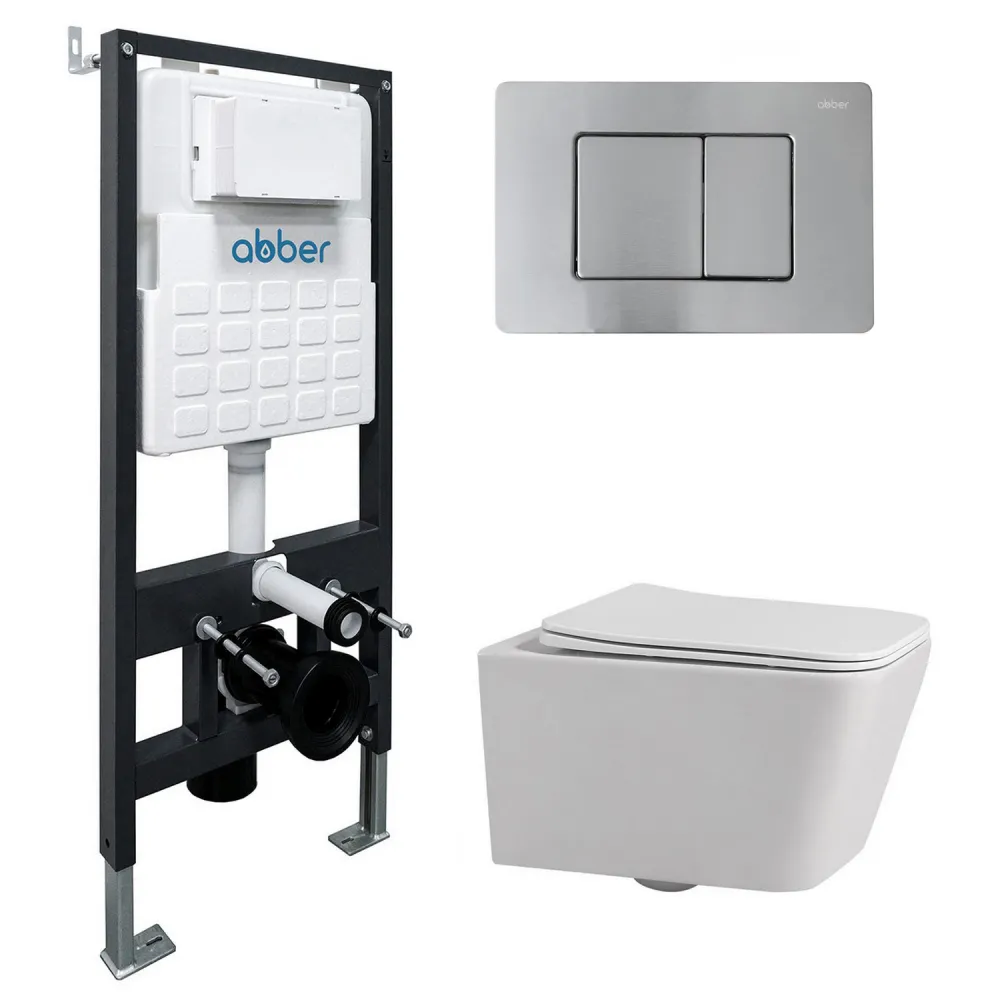 Комплект подвесной унитаз ABBER Rechteck AC1201 белый с инсталляцией AC0105 и кнопкой AC0120MCH матовый хром арт-AC1201-AC0105-AC0120MCH
