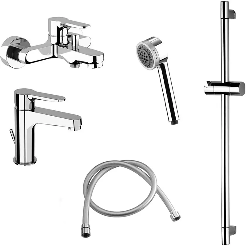 - Полный комплект для ванной: Включает душевой гарнитур с гидромассажной лейкой и штангой высотой 69 см.