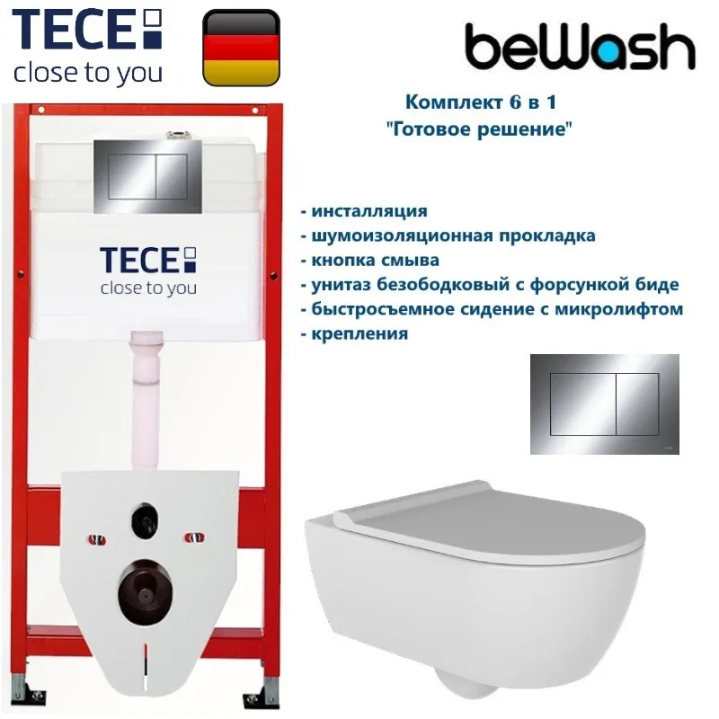 Комплект для монтажа подвесного унитаза: инсталляция TECE, 9400412: стальная рама с порошковым напылением, межосевое расстояние под крепеж. шпильки: 18 см; смывной бачок (резервуар воды объемом 9 литров, объем смыва 3/6 литра), нагрузка 400 кг, кнопка смыва хром. Гарантия 10 лет; BeWash Melville Унитаз подвесной безобод с форс биде со скрытым крепл с гигиенич покрытием в компл с тонким сиденьем микролифт HRKA052N3VP1W5SZ0+VTMU11W5W, сиденье дюропласт: микролифт, быстросъемное. Все крепежи для установки в комплекте. Гарантия 10 лет.