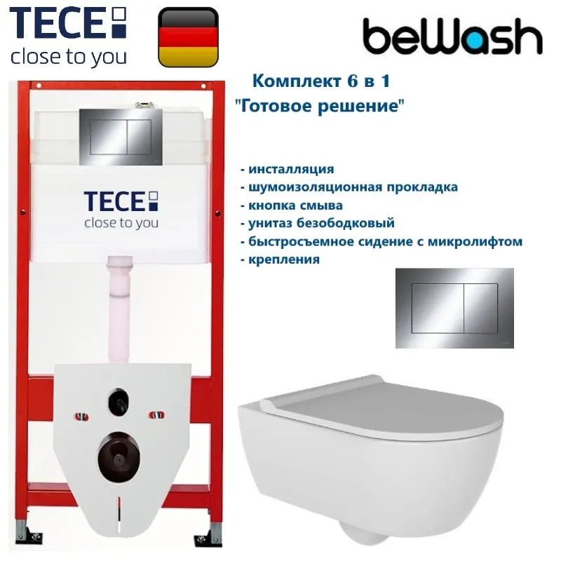 Комплект для монтажа подвесного унитаза: инсталляция TECE, 9400412: стальная рама с порошковым напылением, межосевое расстояние под крепеж. шпильки: 18 см; смывной бачок (резервуар воды объемом 9 литров, объем смыва 3/6 литра), нагрузка 400 кг, кнопка смыва хром. Гарантия 10 лет; BeWash Melville Унитаз подвесной безобод со скрытым крепл с гигиенич покрытием в компл с тонким сиденьем микролифт HRKA052N3VP0W5SZ0+VTMU11W5W5HSZ, сиденье дюропласт: микролифт, быстросъемное. Все крепежи для установки в комплекте. Гарантия 10 лет.