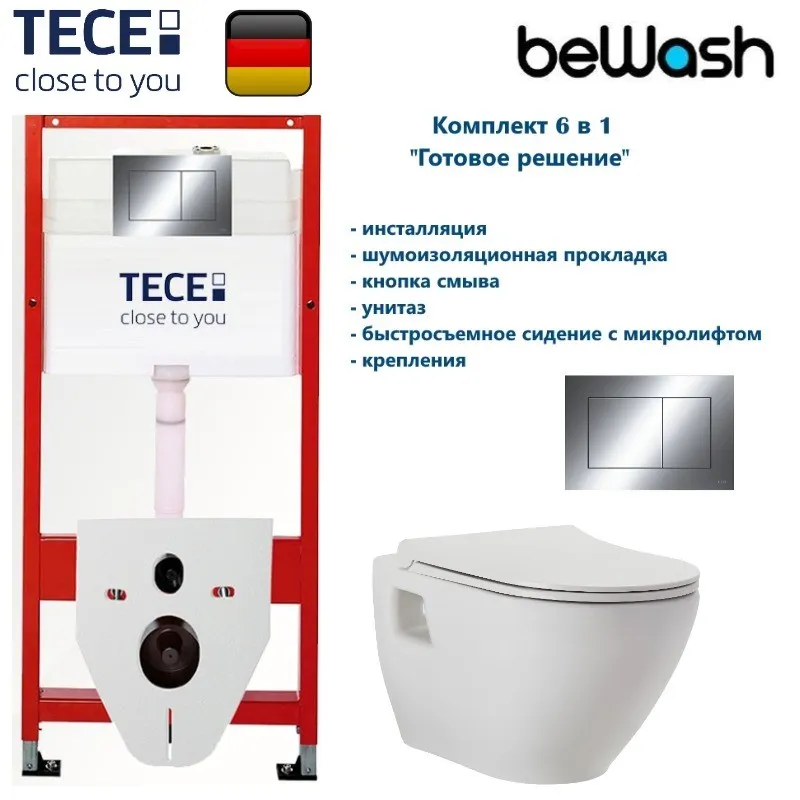 Комплект для монтажа подвесного унитаза: инсталляция TECE, 9400412: стальная рама с порошковым напылением, межосевое расстояние под крепеж. шпильки: 18 см; смывной бачок (резервуар воды объемом 9 литров, объем смыва 3/6 литра), нагрузка 400 кг, кнопка смыва хром. Гарантия 10 лет; BeWash Vettern Унитаз подвесной с сиденьем микролифт белый глянец 82323201+EVB7382, сиденье дюропласт: микролифт, быстросъемное. Все крепежи для установки в комплекте. Гарантия 10 лет.
