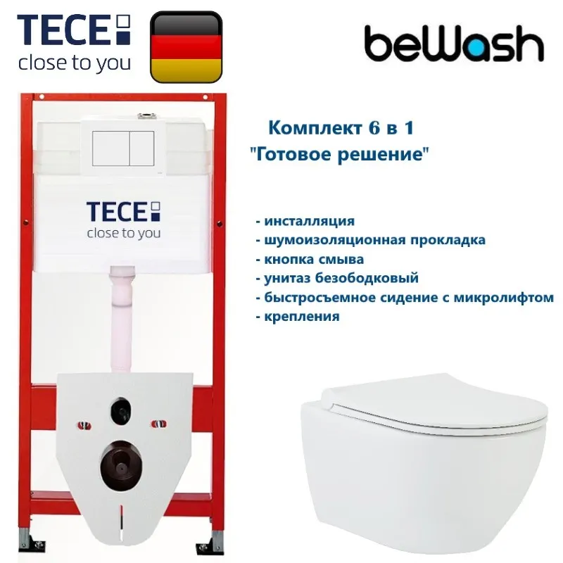 Комплект для монтажа подвесного унитаза: инсталляция TECE, 9400413: стальная рама с порошковым напылением, межосевое расстояние под крепеж. шпильки: 18 см; смывной бачок (резервуар воды объемом 9 литров, объем смыва 3/6 литра), нагрузка 400 кг, кнопка смыва цвет: белый. Гарантия 10 лет; BeWash Bogen Унитаз подвесной безободковый с сиденьем микролифт белый глянец 88303201: безободковый смыв, сиденье дюропласт: микролифт, быстросъемное. Все крепежи для установки в комплекте. Гарантия 10 лет.