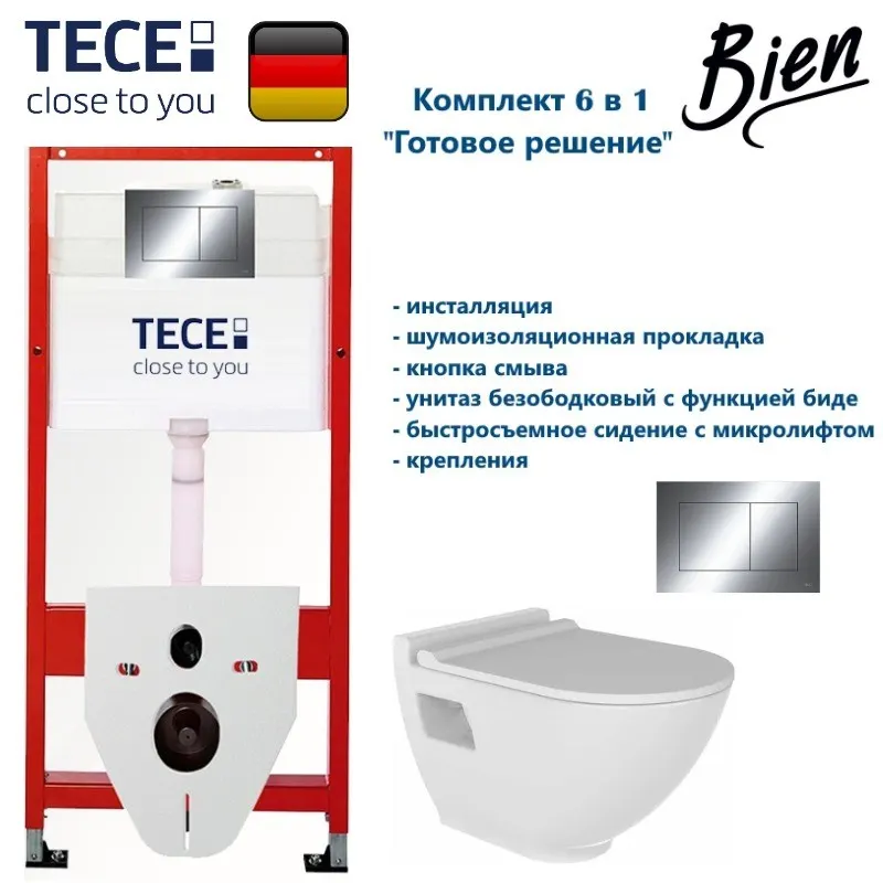 КОМПЛЕКТ TECE + BIEN: 9400412 Инсталляция для подвесного унитаза TECE + Bien HARMONY Унитаз подвесной безободковый с функцией биде с гигиеническим покрытием в комплекте с тонким сиденьем микролифт HRKA052N2VP1W5000+VTMU11W5W5HB0 арт-TC412N2VP1