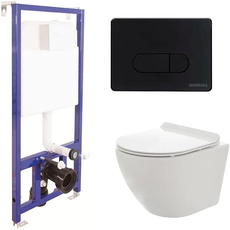 Комплект унитаза AQUAme AQM2002 с инсталляцией Berges Novum D5 040235 с сиденьем Микролифт и Черной матовой клавишей смыва