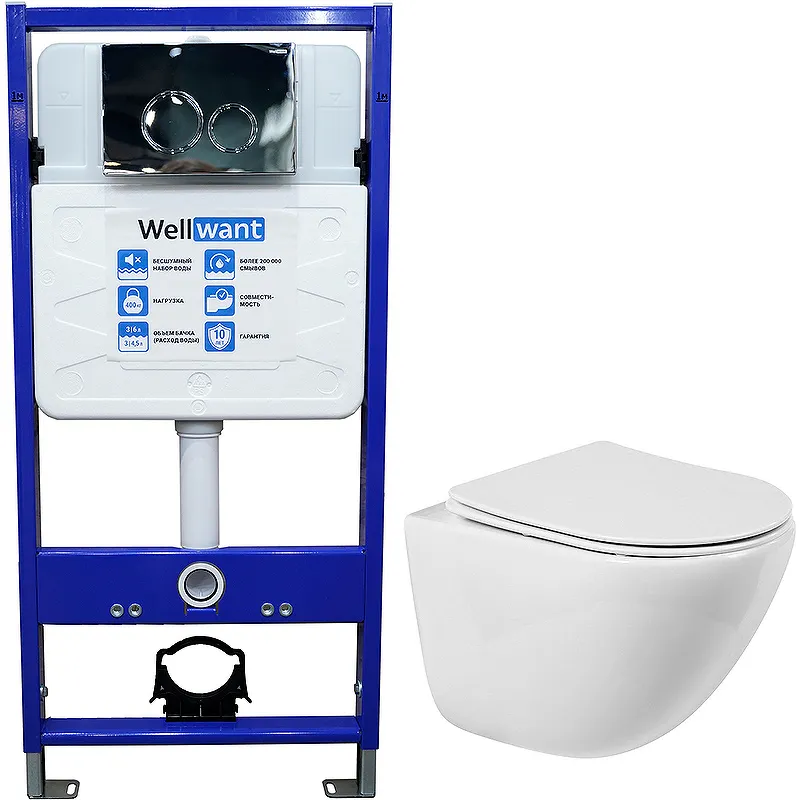 Комплект унитаза BelBagno Amanda BB051CHR+BB051SC с инсталляцией WellWant Standart 50 WWISI1110B, с сиденьем Микролифт и клавишей смыва Хром глянцевый.Характеристики:Унитаз: Цвет: белый. Материал: санфаянс. Габариты (ШхВхД): 360х360х495 мм. Безободковая конструкция. Направление выпуска: горизонтальный (в стену). Организация смывающего потока: каскадный слив. Система антивсплеск. Монтаж: подвесной. Сиденье из дюропласта с плавным опусканием крышки (микролифт), быстросъемное. Инсталляция: Цвет рамы: синий. Материал рамы: сталь 2 мм, покрыта антикоррозийным покрытием. Габариты (ШхВхГ): 50x113x10 см. Сливной бачок с защитой от конденсата. Межосевое расстояние под крепеж. шпильки: 18/23 см. Режим слива воды: с двумя режимами слива 4,5 - 6 л. Объем смывного бачка: 6 л. Диаметр слива: 9 см. Для капитальных стен. Инсталляция выдерживает вес до 400 кг. Максимальный уровень шума до 13 дБа. Клавиша смыва: Материал: пластик. Цвет: хром глянцевый
