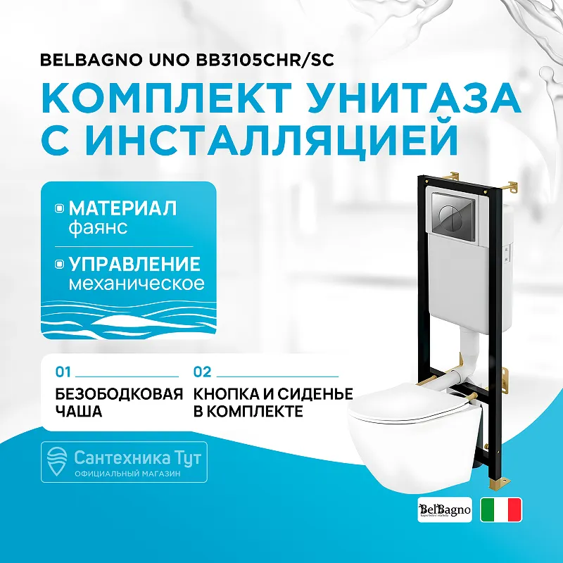 Комплект унитаза BelBagno Uno BB3105CHR/SC с инсталляцией Cersanit Black 35 S-IN-BLACK-Cg-w с сиденьем Микролифт и клавишей смыва Хром.Характеристики:Унитаз: Цвет: белый. Материал: фаянс. Размеры (ШхВхД): 360х360х482 мм. Безободковая конструкция унитаза. Организация смывающего потока: каскадный слив. Система антивсплеск. Направление выпуска: горизонтальное (в стену). Монтаж: подвесной. Сиденье из дюропласта с плавным опусканием крышки (микролифт). Инсталляция: Размеры (ШхВхГ): 350х1200х245 мм. Монтажная высота: 1200 мм. Монтажная глубина: 245 мм. Метод крепления: в пол, в капитальную стену. Межосевое расстояние под крепежные шпильки: 180-230 мм. Подвод воды: сверху бачка. Объем смыва: 3/6 л. Максимальная нагрузка: 400 кг. Клавиша смыва: Цвет: хром глянцевый. Материал: пластик. Двойной смыв. Управление: механическое. В комплекте поставки: Унитаз BelBagno Uno BB3105CHR/SC. Крышка-сиденье. Крепления. Инсталляция Cersanit Black 35 S-IN-BLACK-Cg-w