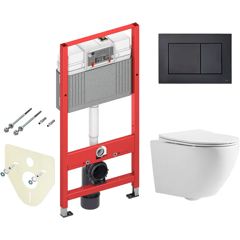 Комплект унитаза CeramaLux 2197 с инсталляцией Tece Now 9400414, с сиденьем Микролифт и Черной матовой клавишей смыва.Характеристики:Унитаз: Цвет: белый. Материал: санфаянс. Размеры (ШхВхД): 370х360х490 мм. Направление выпуска: горизонтальное (в стену). Безободковая конструкция Rimless: отсутствие смывного края делает уход за унитазом проще. Организация смывающего потока: каскадный слив. Система антивсплеск. Антигрязевое покрытие. Подвод воды: сзади чаши. Монтаж: подвесной. Цвет фурнитуры: хром. Сиденье из дюропласта с плавным опусканием крышки (микролифт), быстросъемное. Инсталляция:Монтажная рама: Цвет: красный. Материал: сталь. Высота: 1120 мм. Регулировка высоты: 200 мм. Монтажная глубина: 160 мм. Установочное расстояние для унитаза: 180 или 230 мм. Подвод воды: сверху бачка. Метод крепления: в капитальную стену и пол. Диаметр слива: 90 мм. Диаметр переходника для слива: 110 мм. Антивибрационная прокладка. Сверхбыстрое наполнение