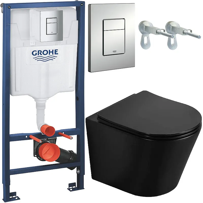 Комплект унитаза CeramaLux B2330-1MB с инсталляцией Grohe Rapid SL 38772001 с сиденьем Микролифт и клавишей смыва Хром.Унитаз с крышкой-сиденьем: Материал: санфаянс. Безободковая конструкция Rimless: отсутствие смывного края делает уход за унитазом проще. Механизм плавного закрывания крышки. Цвет: черный матовый. Размеры (ШхВхД): 36,5x36,5x48 см. С системой антивсплеск. С антигрязевым покрытием. Фурнитура: хром. Форма: круглая. Монтаж: подвесной. Организация смывающего потока: каскадный слив. Выпуск: горизонтальный (в стену). Материал сиденья: дюропласт. Инсталляция: Габариты (ШхВхГ): 50x113x23 см. Монтаж перед стеной или стеной-перегородкой. Самонесущая стальная рама с порошковым напылением подготовлена для облицовки. Фиксированные подключения, быстрая регулировка по высоте, крепежный материал. 2 болта-держателя для унитаза, крепление для керамики. Расстояние между болтами 18/23 см, выходной патрубок для унитаза диаметром 9 см, редуктор диаме