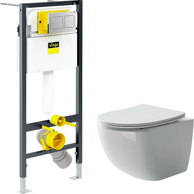 Комплект унитаза Ceramicanova Forma CN3009 с инсталляцией с инсталляцией Viega Prevista Dry 8524.14 792596 со смывным бачком, с сиденьем Микролифт и клавишей смыва Хром.Характеристики:Унитаз: Цвет: белый. Материал: санфарфор. Габариты (ШхВхД): 365x320x485 мм. Направление выпуска: горизонтальное (в стену). Система антивсплеск. Безободковая конструкция унитаза. Монтаж: подвесной. Сиденье из дюропласта с плавным опусканием крышки (микролифт), быстросъемное. Инсталляция:Монтажная рама с бачком: Материал рамы: сталь. Габариты (ШхВxГ): 490х1120х120 мм. Объем смывного бачка: 3/6 л. Управление: механическое. Режим слива воды: 2-х объемный. Заводские настройки малого объема смыва: 3 л. Диапазон настройки малого объема смыва: 2 - 4 л. Заводские настройки большого объема смыва: 6 л. Диапазон настройки большого объема смыва: 3.5 - 7.5 л. Расчетная нагрузка до 400 кг. Подвод воды: сзади бачка, сверху бачка. Клавиша смыва: Цвет: хром. Материал: ABS-пластик.
