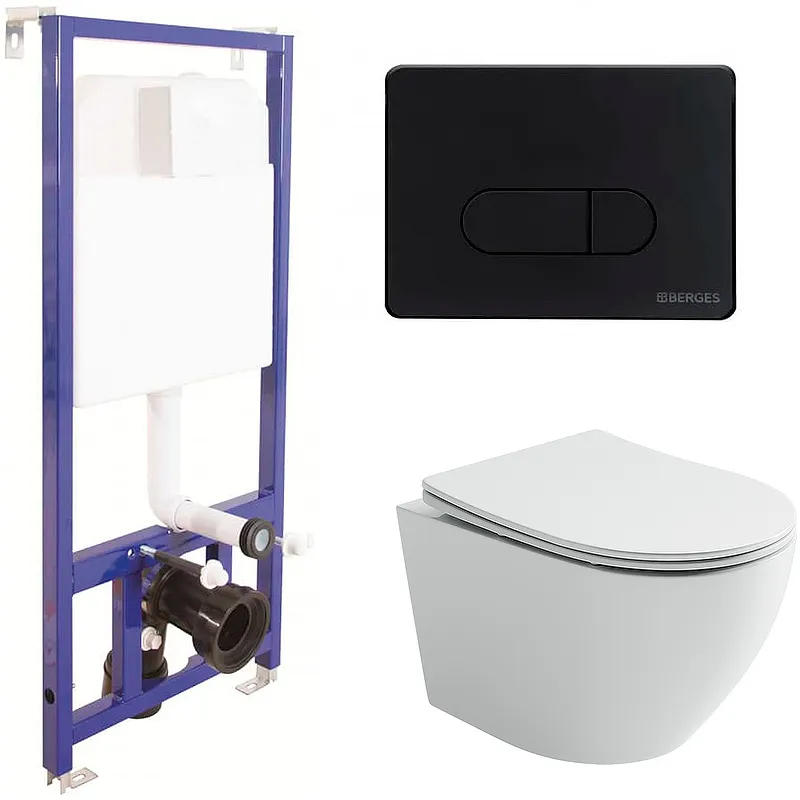 Комплект унитаза Ceramicanova Uno Rimless CN11001 с инсталляцией Berges Novum D5 040235 с сиденьем Микролифт и Черной матовой клавишей смыва.Характеристики:Унитаз: Цвет: белый. Материал: санфарфор. Габариты (ШхВхД): 360х360х490 мм. Безободковая конструкция Rimless (обеспечивающая безупречную чистоту и легкий уход). Особенность конфигурации безободковой чаши: защитный бортик от выплеска воды. Глубокий смыв. Направление выпуска: горизонтальное (в стену). Монтаж: подвесной. Ультратонкое сиденье из дюропласта с плавным опусканием крышки (Soft Close-микролифт), быстросъемное. Инсталляция:Монтажная рама: Габариты (ШхВхГ): 525х1390х175 мм. Металлический каркас, окрашенный антикоррозийной эмалью, расчетная нагрузка до 400 кг. Межосевое расстояние: 18 и 23 см. Подключение воды: сверху. Объем смыва 3/6 литра с возможностью регулировки. Уровень шума при давлении 3 бар не превышает 13 дБ. Монтаж: в стену, в пол. Резервуар воды объемом 10 литров