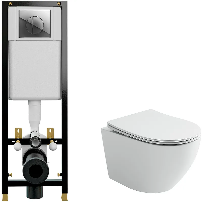 Комплект унитаза Ceramicanova Uno Rimless CN11001 с инсталляцией Cersanit Black 35 S-IN-BLACK-Cg-w с сиденьем Микролифт и клавишей смыва Хром.Характеристики:Унитаз: Цвет: белый. Материал: санфарфор. Габариты (ШхВхД): 360х360х490 мм. Безободковая конструкция Rimless (обеспечивающая безупречную чистоту и легкий уход). Особенность конфигурации безободковой чаши: защитный бортик от выплеска воды. Глубокий смыв. Направление выпуска: горизонтальное (в стену). Монтаж: подвесной. Ультратонкое сиденье из дюропласта с плавным опусканием крышки (Soft Close-микролифт), быстросъемное. Инсталляция: Размеры (ШхВхГ): 350х1200х245 мм. Монтажная высота: 1200 мм. Монтажная глубина: 245 мм. Метод крепления: в пол, в капитальную стену. Межосевое расстояние под крепежные шпильки: 180-230 мм. Подвод воды: сверху бачка. Объем смыва: 3/6 л. Максимальная нагрузка: 400 кг. Клавиша смыва: Цвет: хром глянцевый. Материал: пластик. Двойной смыв. Управление: механическое. В