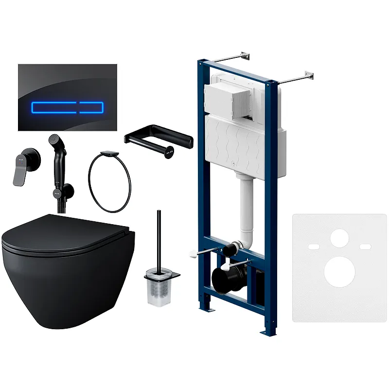 Комплект унитаза с инсталляцией AM.PM Spirit CK70GH Черный матовый с сиденьем Микролифт с Черной глянцевой клавишей смыва с гигиеническим душем и аксессуарами для ванной комнаты