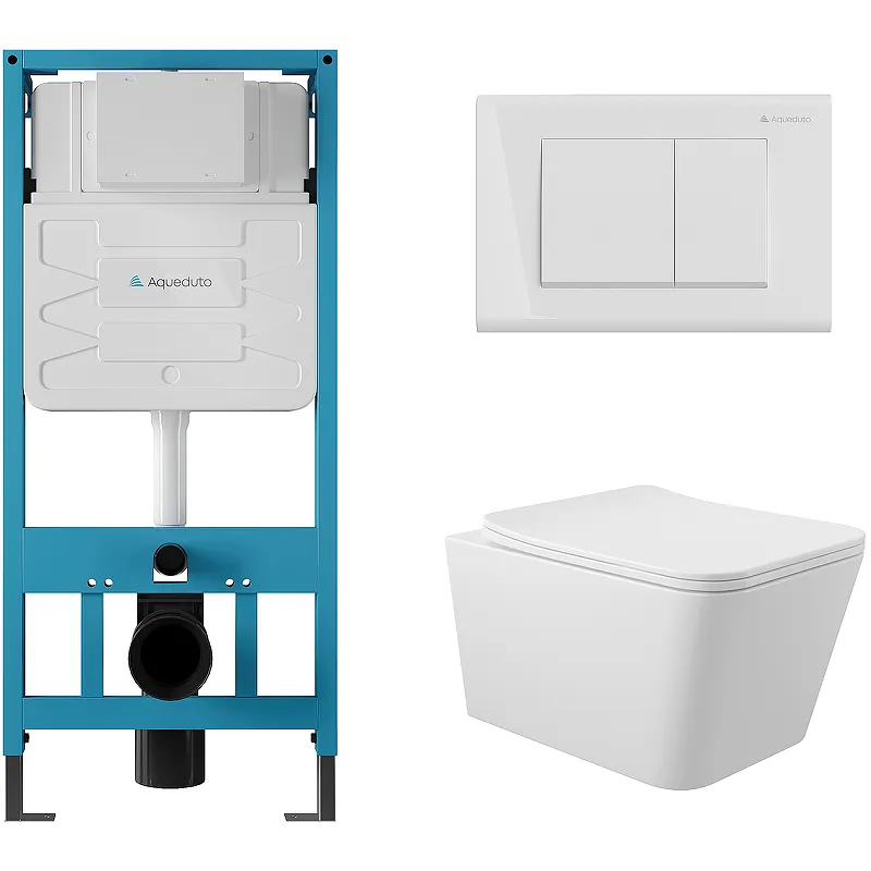 Комплект унитаза с инсталляцией Aqueduto Macio AQDS012 с сиденьем Микролифт и Белой глянцевой клавишей смыва.Характеристики:Унитаз: Цвет: белый глянцевый. Материал: фаянс. Габариты (ШхВхД): 370х290х520 мм. Антигрязевое покрытие. Антибактериальное покрытие. Устойчив к царапинам. Безободковая конструкция. Направление выпуска: горизонтальное (в стену). Смыв: прямой. Организация смывающего потока: каскадный. Система антивсплеск. Экономия воды. Монтаж: подвесной. Сиденье из дюропласта с плавным опусканием крышки (Микролифт), быстросъемное, ультратонкое. Инсталляция: Цвет: синий. Материал: сталь, ПЭВП. Габариты (ШхВхГ): 500х1112х260 мм. Объем смыва: 5/7.5 л, можно регулировать до 3/4.5 л и 4/6 л. Сливное колено регулируется вверх и вниз: 90-115 мм; спереди и сзади: 130-166 мм. Настенные кронштейны регулируемые 135-190 мм. Гибкие опорные ножки с цинковым покрытием, регулируемые в пределах 0-220 мм. Подвод воды: сверху или сзади. Защита от