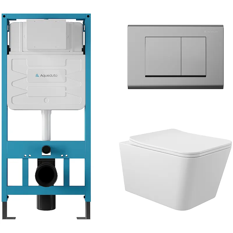 Комплект унитаза с инсталляцией Aqueduto Macio AQDS018 с сиденьем Микролифт и клавишей смыва Хром.Характеристики:Унитаз: Цвет: белый глянцевый. Материал: фаянс. Габариты (ШхВхД): 370х290х520 мм. Антигрязевое покрытие. Антибактериальное покрытие. Устойчив к царапинам. Безободковая конструкция. Направление выпуска: горизонтальное (в стену). Смыв: прямой. Организация смывающего потока: каскадный. Система антивсплеск. Экономия воды. Монтаж: подвесной. Сиденье из дюропласта с плавным опусканием крышки (Микролифт), быстросъемное, ультратонкое. Инсталляция: Цвет: синий. Материал: сталь, ПЭВП. Габариты (ШхВхГ): 500х1112х260 мм. Объем смыва: 5/7.5 л, можно регулировать до 3/4.5 л и 4/6 л. Сливное колено регулируется вверх и вниз: 90-115 мм; спереди и сзади: 130-166 мм. Настенные кронштейны регулируемые 135-190 мм. Гибкие опорные ножки с цинковым покрытием, регулируемые в пределах 0-220 мм. Подвод воды: сверху или сзади. Защита от конденсата. Нагрузка до 400 кг. Клавиша смыва: Цвет: хром. Материал: ABS-пластик. Размер (ШхВхД): 245х165х11 мм. Управление: механическое. Режим слива воды: две кнопки (полный слив/эконом). В комплекте поставки: Унитаз Aqueduto Macio MAC0110. Крышка-сиденье. Комплект креплений для сиденья. Комплект креплений для скрытого монтажа унитаза. Инструкция. Инсталляция Aqueduto Tecnica TEC01. Звукоизоляционная прокладка. Латунный угловой клапан. Сливной комплект из 3 предметов (сливное колено Φ110, сливная труба, крышка). Клавиша смыва Aqueduto Quadrado QUA0100.