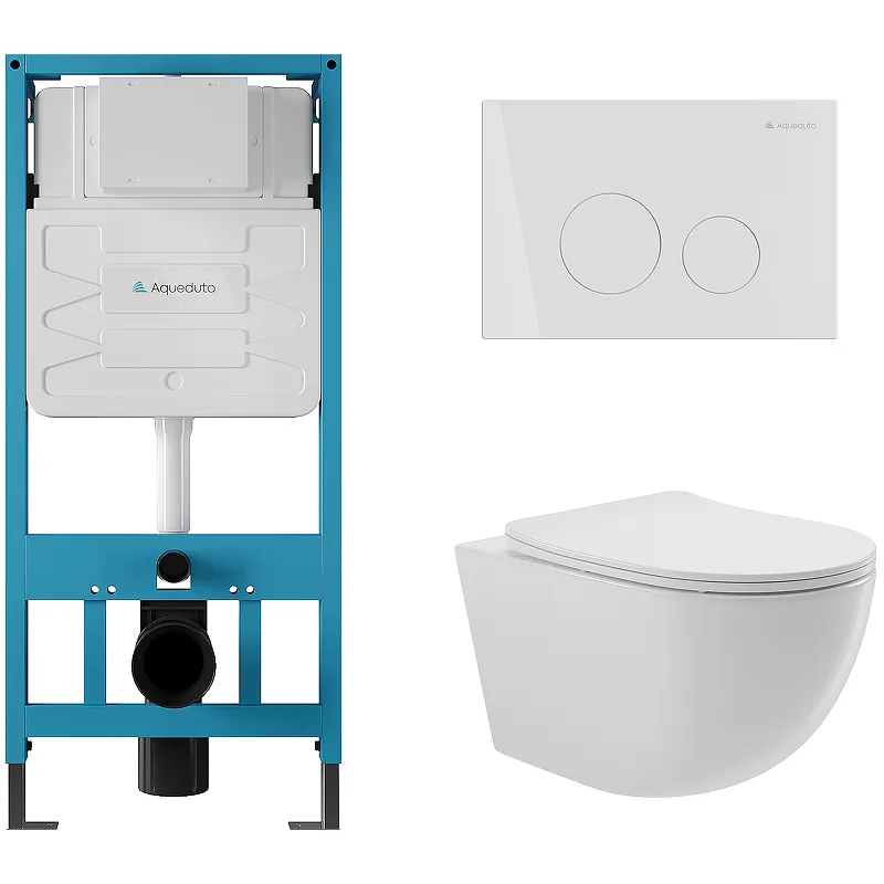 Комплект унитаза с инсталляцией Aqueduto Ovo AQDS019 с сиденьем Микролифт и Белой глянцевой клавишей смыва.Характеристики:Унитаз: Цвет: белый глянцевый. Материал: фаянс. Габариты (ШхВхД): 360х320х525 мм. Антигрязевое покрытие. Антибактериальное покрытие. Устойчив к царапинам. Безободковая конструкция. Направление выпуска: горизонтальное (в стену). Смыв: прямой. Организация смывающего потока: каскадный. Система антивсплеск. Экономия воды. Монтаж: подвесной. Сиденье из дюропласта с плавным опусканием крышки (Микролифт), быстросъемное, ультратонкое. Инсталляция: Цвет: синий. Материал: сталь, ПЭВП. Габариты (ШхВхГ): 500х1112х260 мм. Объем смыва: 5/7.5 л, можно регулировать до 3/4.5 л и 4/6 л. Сливное колено регулируется вверх и вниз: 90-115 мм; спереди и сзади: 130-166 мм. Настенные кронштейны регулируемые 135-190 мм. Гибкие опорные ножки с цинковым покрытием, регулируемые в пределах 0-220 мм. Подвод воды: сверху или сзади. Защита от ко