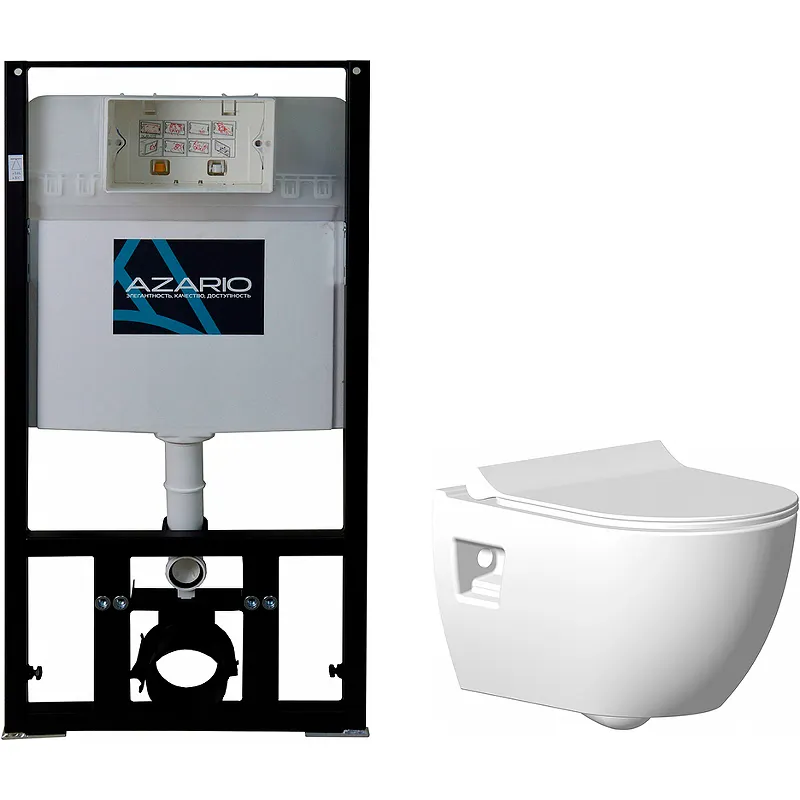 Комплект унитаза с инсталляцией Azario AZ-8010-1000+Ocean plus с сиденьем Микролифт.Характеристики:Унитаз: Цвет: белый. Материал: керамика. Габариты (ШхВхД): 360х350х520 мм. Направление выпуска: горизонтальный (в стену). Безободковая конструкция. Система антивсплеск. Монтаж: подвесной. Сиденье из дюропласта с плавным опусканием крышки (Микролифт). Инсталляция: Цвет рамы: черный. Материал: металл, пластик. Габариты (ШхВхГ): 500х1600х195 мм. Бачок из полипропилена – отличается высокой прочностью. Бачок инсталляции с функцией защиты от конденсата и звукоизоляцией. Управление: механическое. Смывной бачок объемом 3/6 л. Толщина бачка 12 см. Скорость наполнения: 6 л за 39 секунд при давлении 3 бар. Количество промывочной воды: 3/6 литров (можно отрегулировать между 2.5-4.5 л / 4.5-9 л). Тихий смыв и налив воды. Отвод сточных вод может быть вертикальным, в низ или наклонным. Межосевое расстояние для монтажа унитаза 180/230 мм. Максимальная нагрузка: 400 кг. Установка: в к