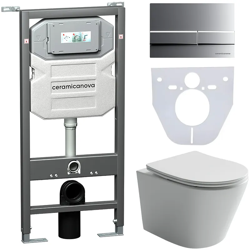 Комплект унитаза с инсталляцией Ceramicanova Balearica CN6000_1002M_1000 с сиденьем Микролифт и клавишей смыва Хром матовый.Характеристики:Унитаз: Цвет: белый. Материал: санфарфор. Габариты (ШxВxД): 365х340х490 мм. Направление выпуска: горизонтальное (в стену). Организация смывающего потока: воронка-водоворот. Безободковая конструкция. Система антивсплеск. Защитный бортик от выплеска воды. Монтаж: подвесной. Сиденье из дюропласта с плавным опусканием крышки (микролифт), быстросъемное. Инсталляция: Цвет: серый. Материал: металл, пластик. Тип инсталляции: для подвесного унитаза. Размеры (ШхВхГ): 500х1140х260 мм. Межосевое расстояние под крепежные шпильки: 180-230 мм. Объем смыва: 3/6 л (4.5 л). Подвод воды: сверху бачка. Бачок герметизированный от попадания конденсата. Ножки с регулировкой: 0-200 мм. Монтажная глубина: 147 мм. Монтажная высота: 1140 мм. Диаметр слива: 90 мм. Диаметр переходника для слива: 110 мм. Метод крепления: в капит