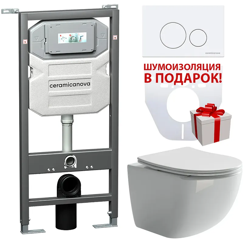 Комплект унитаза с инсталляцией Ceramicanova Forma CN3009_1001W_1000, с сиденьем Микролифт и Белой клавишей смыва.Характеристики:Унитаз: Цвет: белый. Изготовлен из сантехнического фарфора. Низкопористая поверхность унитаза не впитывает загрязнения и запахи, устойчива к изменениям цвета и неприхотлива в уходе. Габариты (ШxВxД): 365х320х485 мм. Направление выпуска: горизонтальное (в стену). Безободковая конструкция Rimless: отсутствие труднодоступных мест обеспечивает дополнительную гигиеничность и облегчает уборку. Система антивсплеск. Скрытый крепеж: установленный унитаз имеет эстетичный вид. Монтаж: подвесной. Сиденье из дюропласта с плавным опусканием крышки (микролифт), быстросъемное. Инсталляция: Цвет: серый. Материал: металл, пластик. Тип инсталляции: для подвесного унитаза. Размеры (ШхВхГ): 500х1140х260 мм. Межосевое расстояние под крепежные шпильки: 180-230 мм. Объем смыва: 3/6 л (4.5 л). Подвод воды: сверху бачка. Бачок герметизирован