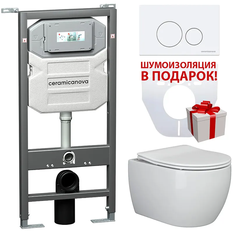 Комплект унитаза с инсталляцией Ceramicanova Play CN3001_1001W_1000, с сиденьем Микролифт и Белой клавишей смыва.Унитаз Ceramicanova Play CN3001 неприхотлив в уходе. Выполнен из сантехнической керамики. Лаконичный дизайн идеально впишется в современный интерьер ванной комнаты. Специальное покрытие позволяет сохранять первоначальный вид на протяжении всего срока службы, не впитывает посторонние запахи. Верхняя часть унитаза устойчива к ударам.Характеристики:Унитаз: Цвет: белый. Материал: санфаянс. Габариты (ШxВxД): 370х340х490 мм. Направление выпуска: горизонтальное (в стену). Организация смывающего потока: воронка-водоворот. Безободковая конструкция. Система антивсплеск. Монтаж: подвесной. Сиденье из дюропласта с плавным опусканием крышки (микролифт), быстросъемное. Инсталляция: Цвет: серый. Материал: металл, пластик. Тип инсталляции: для подвесного унитаза. Размеры (ШхВхГ): 500х1140х260 мм. Межосевое расстояние под крепежные шпильки: 180-230