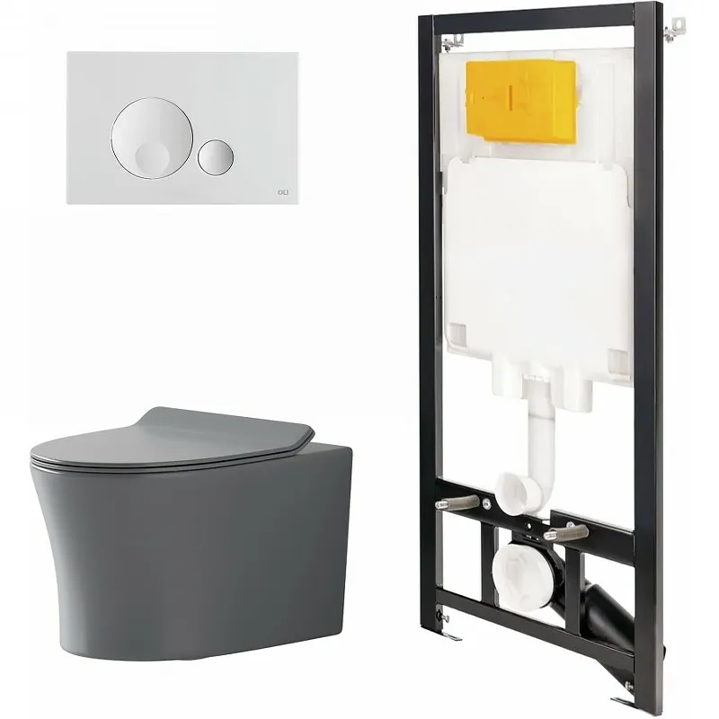 Комплект унитаза с инсталляцией Point Вега 886914GBO1+PN41711GM Серый матовый с сиденьем Микролифт и Белой клавишей смыва