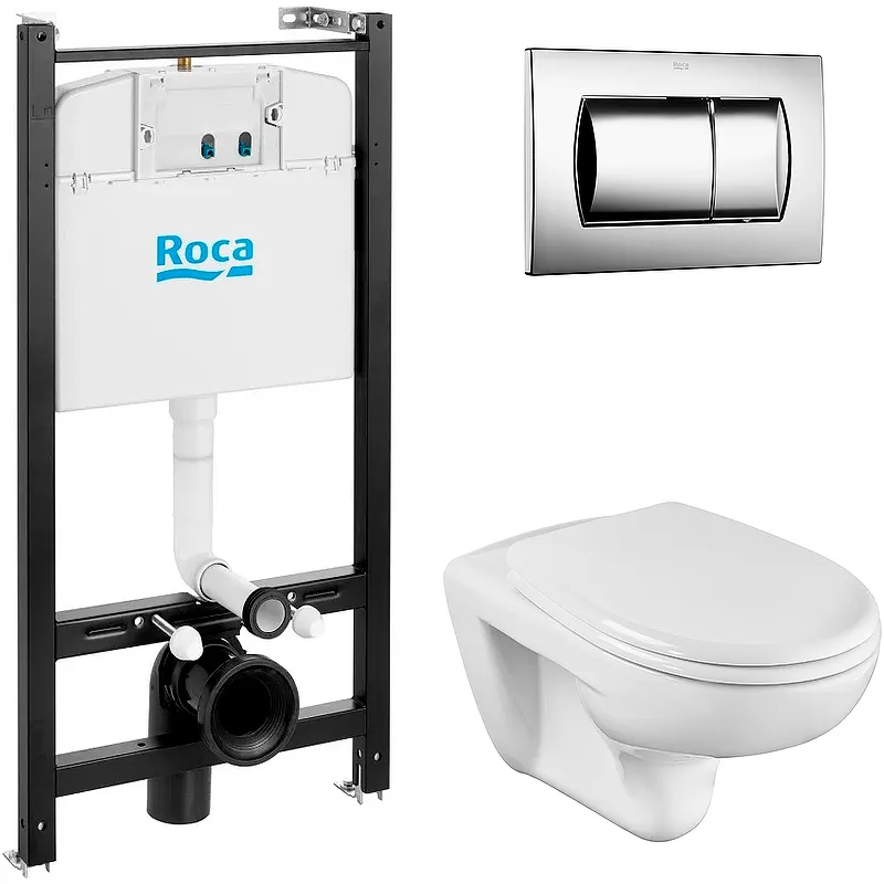 Комплект унитаза с инсталляцией Roca Mateo 893100010 с сиденьем Микролифт и клавишей смыва Хром.Комплект унитаза с инсталляцией Roca Mateo 893100010 подойдет для каждой квартиры за счет стандартного дизайна и фактуры. Система выполнена из фарфора, материал прочный и без труда чистится бытовыми средствами. Овальная форма и белая цветовая гамма делают систему универсальной для сантехники вне зависимости от размера и цвета. Полочка и прочие девайсы не предусмотрены.Предмет предполагает два режима слива с учетом степени загрязнений, а горизонтальный выпуск в пол защищает сантехнику от засора. Управление происходит механическим нажатием кнопки, а опция микролифта Soft Close позволяет плавно опускать крышку на сидение. Еще одна функция товара - антивсплеск, которая снижает разбрызгивание воды при смывании.Характеристики:Унитаз: Цвет: белый. Материал: фарфор. Габариты чаши унитаза (ШхВхГ): 355х350х520 мм. Тип чаши: воронкообразная. Тип смыва: душевой (круговой). Направление выпуска: горизонтальное (в стену). Система антивсплеск. Монтаж: подвесной. Сиденье из дюропласта с плавным опусканием (микролифт), быстросъемное. Инсталляция: Материал рамы: металл. Цвет: черный, защищена порошковым покрытием. Габариты (ШхВхД): 547х1125х280 мм. Подвод воды: сверху посередине, сверху справа. Объем смыва: 3/6, 3/4.5 л. Шумоизоляция и изоляция от конденсационной влаги, пенопласт внутри. Наливной механизм: уровень шума меньше 30 dBA. Сливной механизм с силиконовым запорным кольцом, надежность клапана 200 000 циклов. Межосевое расстояние: 180 и 230 мм. Максимальная нагрузка: 400 кг. Метод установки сливного бачка: в стену (скрытый). Клавиша смыва: Размеры (ШхВ): 255х170х22 мм. Цвет клавиши: хром глянец. Материал: пластик. Режим слива воды: две кнопки (режим эконом). Управление: механическое. В комплекте поставки: Чаша унитаза. Крышка-сиденье. Инсталляция. Клавиша смыва. Комплект креплений.