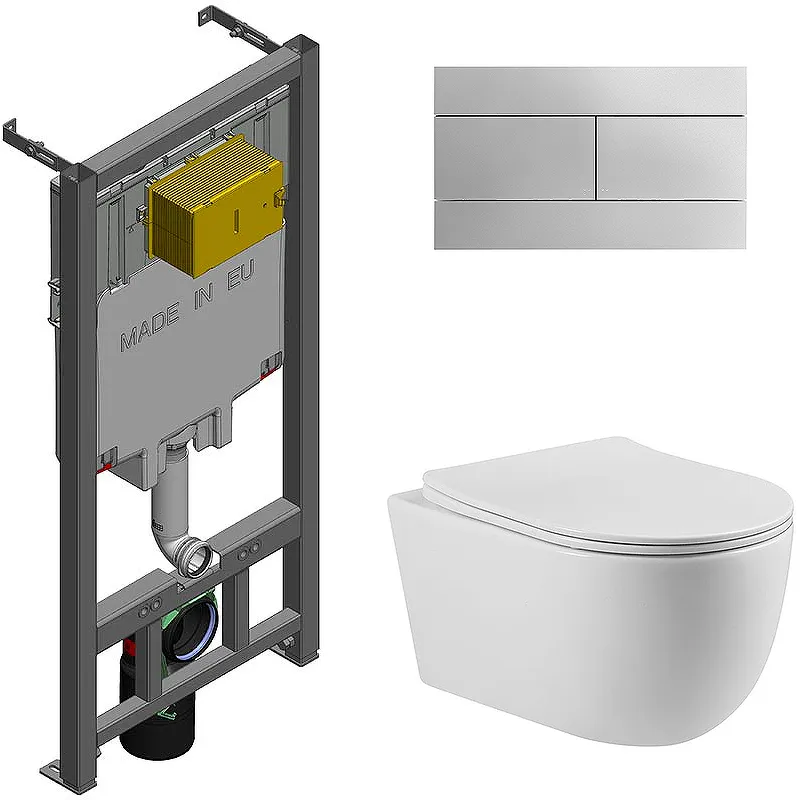 Комплект унитаза Vincea Evo Rimless VT1-34S с сиденьем Микролифт и инсталляцией Jacob Delafon E29025-NF+E4316-CP с клавишей смыва Хром