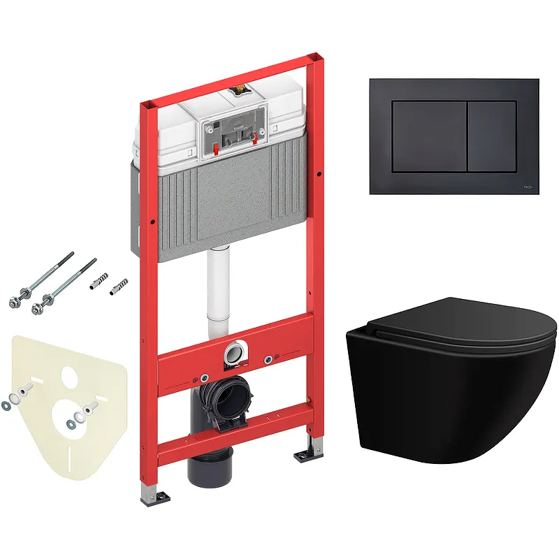 Комплект унитаза WellWant Aura WWU01122B с инсталляцией Tece Now 9400414 с сиденьем Микролифт и Черной матовой клавишей смыва