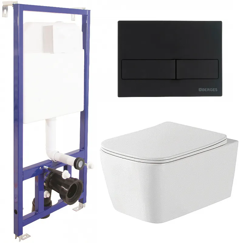 Комплект унитаза WellWant Tesoro WWU01111W с инсталляцией Berges Novum L5 040215 с сиденьем Микролифт и Черной матовой клавишей смыва