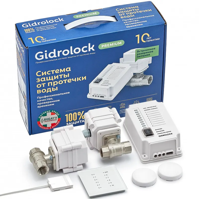 Комплект защиты от протечки воды Gidrоlock Premium Radio Bugatti 3/4 31101022.Комплект Gidrоlock Premium Bugatti предназначен для обнаружения и локализации протечек воды в системах водоснабжения и отопления жилых, загородных домов, офисных зданий, магазинов, даже в момент отключения электроэнергии.Высококачественные итальянские шаровые краны Bugatti с электроприводом Gidrolock автоматически перекроют подачу воды, получив команду от блока управления Premium, при попадании влаги на контакты беспроводного датчика WSR.Характеристики: Способ передачи сигнала: проводной, беспроводной. Система оповещения: звуковой сигнал. Выходная мощность: 0,8 кВт. Резервное питание: аккумулятор 12 Вольт 1,3А. Макс. количество подключаемых проводных датчиков WSР: 200 шт. Макс. количество запрограммированных радиодатчиков WSR: 10 шт. Макс. количество подключаемых электроприводов: 6 шт. Максимальное давление ШЭП: до 40 Атм. Двигатели в приводе: бесколлекторные. Шаровой кран: Bugatti латунь (Италия). Диаметр подключения: 3/4 дюйма. Полное закрытие шарового электропривода до 15 секунд. Шаровые электроприводы не создают гидравлических ударов. Корпус электропривода защищенный герметичный IP65. Максимальная температура ШЭП: до +100 градусов. В комплекте поставки: Блок Управления Gidrоlock Premium (без АКБ) - 1 шт. Аккумуляторная батарея 12 Вольт - 1 шт. ШЭП Gidrоlock Ultimate Bugatti 12V 3/4 - 2 шт. Датчик протечки воды WSР (3м) - 1 шт. Радиодатчик протечки воды WSR, белый - 2 шт. Радиоприемник для радиодатчиков, 9003 белый - 1 шт.