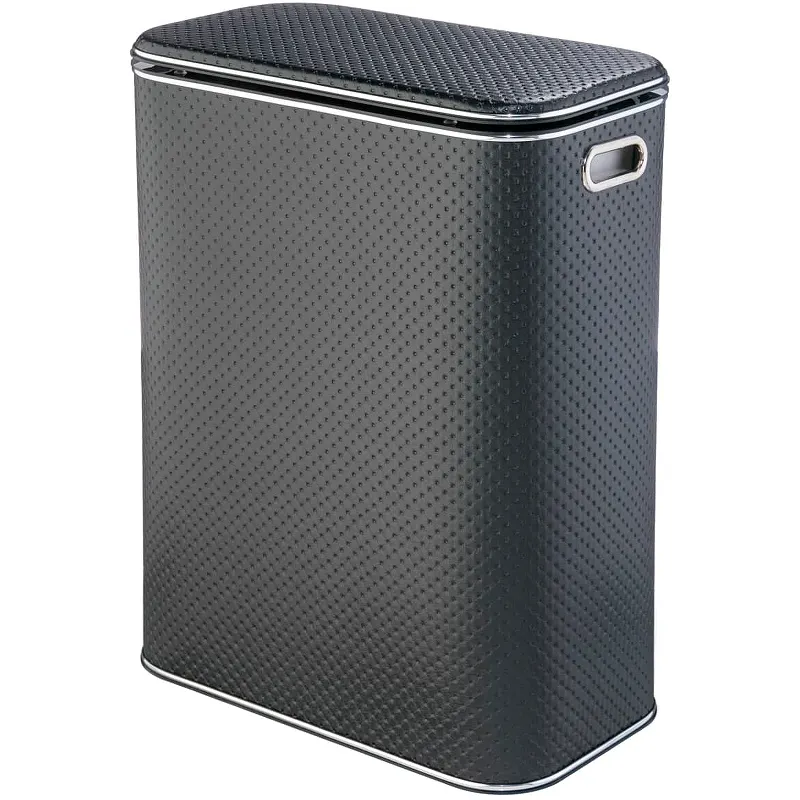 Корзина для белья Geralis PBH-Bb Punto стандартная.Характеристики: Цвет: черный. Кант: хром. Материал: экокожа, ABS-пластик. Габариты (ШхВхД): 450х600х250 мм. Объем: 67 л. Плавное закрывание крышки. Ручки для переноски. Выдерживает вес до 100 кг. Монтаж: напольный.