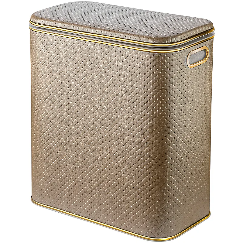 Корзина для белья Geralis PLG-M Punto.Характеристики: Цвет: бежевый. Кант: золото. Материал: экокожа, ABS-пластик. Габариты (ШхВхД): 450х500х250 мм. Объем: 50 л. Плавное закрывание крышки. Ручки для переноски. Выдерживает вес до 100 кг. Монтаж: напольный.