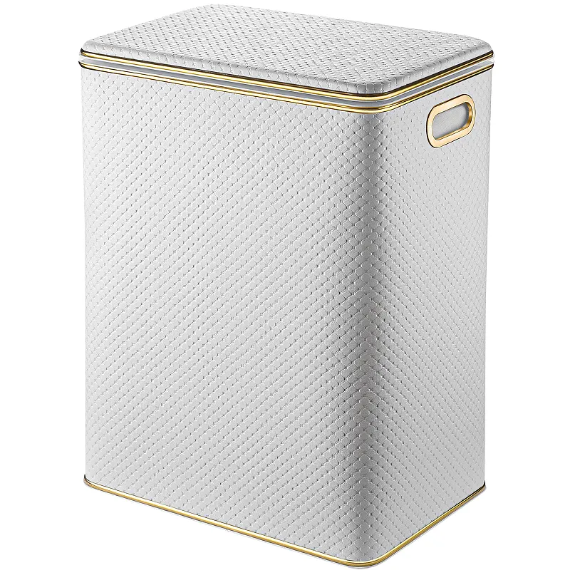 Корзина для белья Geralis PWG-S Punto большая.Характеристики: Цвет: белый. Кант: золото. Материал: экокожа, ABS-пластик. Габариты (ШхВхД): 450х600х300 мм. Объем: 81 л. Плавное закрывание крышки. Ручки для переноски. Выдерживает вес до 100 кг. Монтаж: напольный.