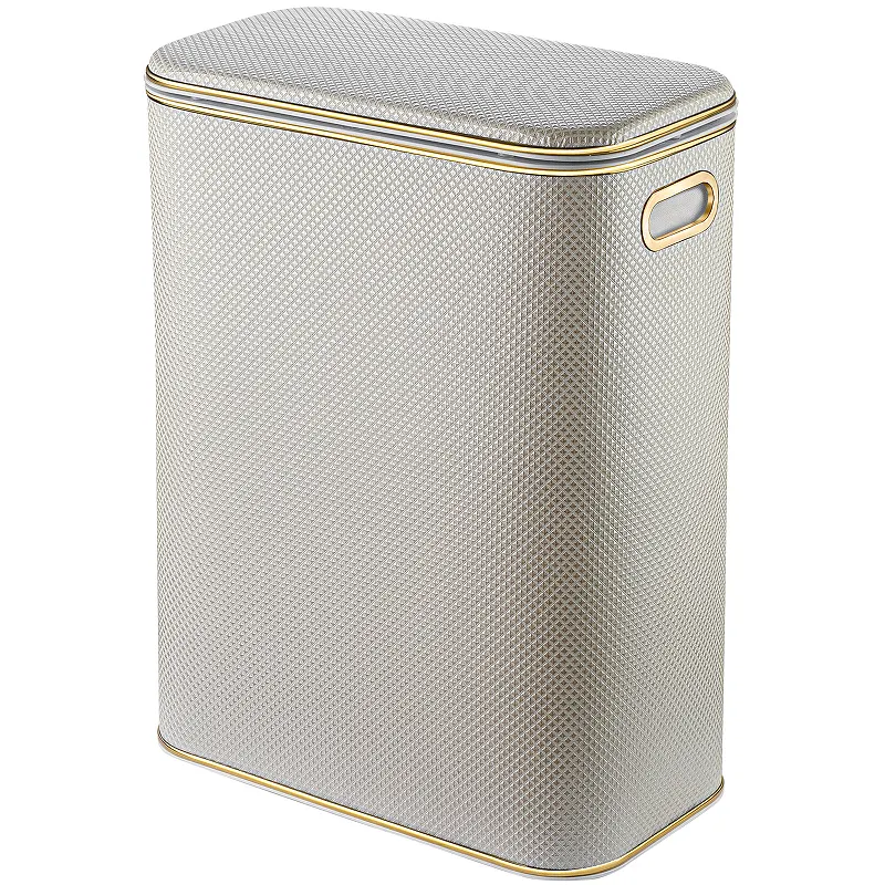 Корзина для белья Geralis RWG-B Ромб стандартная.Характеристики: Цвет: белый. Кант: золото. Материал: экокожа, ABS-пластик. Габариты (ШхВхД): 450х600х250 мм. Объем: 67 л. Плавное закрывание крышки. Ручки для переноски. Выдерживает вес до 100 кг. Монтаж: напольный.