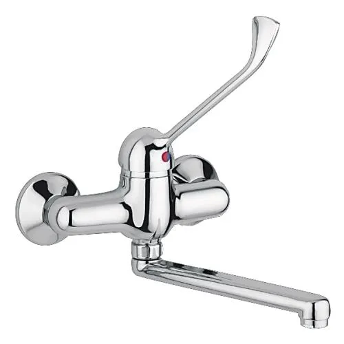 Смеситель с одним рычагом. Простота использования и гигиены, большая длина рычага позволяет легко маневрировать локтем, когда руки грязные.