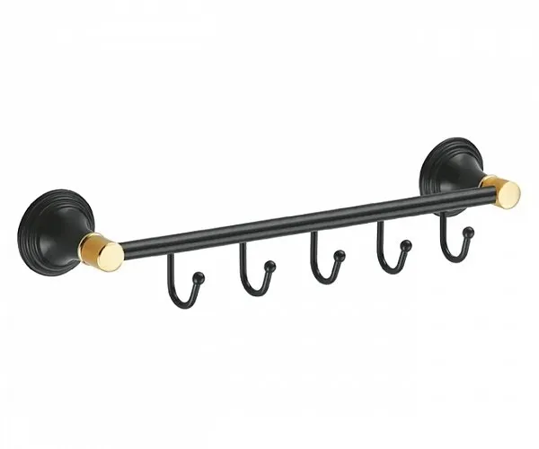 Крючки для полотенец Fixsen Luksor FX-71605-5B: планка на 5 крючков в ванную комнату.Крючки выполнены в элегантном дизайне, который будет органично смотреться в интерьере ванной в современным стиле. Использованы материалы: сплав металлов, латунь с Черным покрытием и деталями в цвете Золото. Размеры: 8,5x8,5x36 см. Крепление на стену шурупами (в комплекте поставки). Блистерная упаковка.