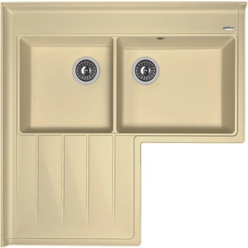 - Угловая мойка с двумя чашами: Максимальное использование пространства благодаря двум вместительным чашам.