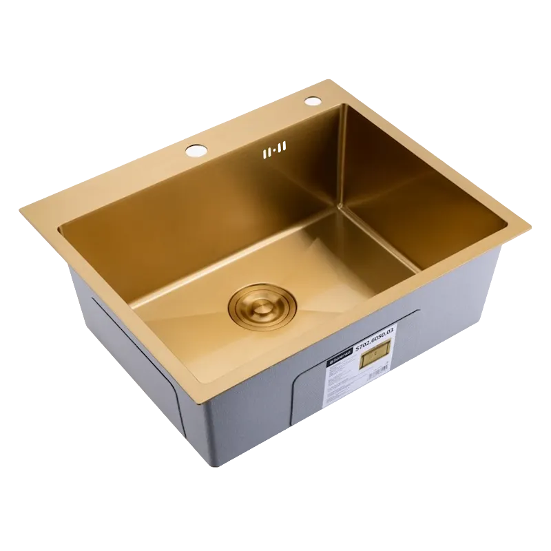 Кухонная мойка Splenka S702.6050.03, золотой сатин. Размер - 600*500*220мм. Кухонные мойки Splenka отличаются практичностью и современным дизайном. Прямоугольные и квадратные раковины для кухни из нержавейки станут идеальным решением для любой кухни. Нержавеющая врезная мойка - отличный выбор для тех, кто ценит качество и долговечность. Изготовлена из качественной нержавеющей стали, которая не боится ни бытовой химии, ни царапин. Металлическая раковина для кухни добавит вашей кухне современности и функциональности. Удобный универсальный монтаж на ваш выбор: врезным способом, поверх столешницы или подстольный. Комплектующие - сифон с выходом для подключения посудомоечной машины и фильтра для питьевой воды, крепление. Толщина стали: верх - 3 мм / чаша - 0.6 мм